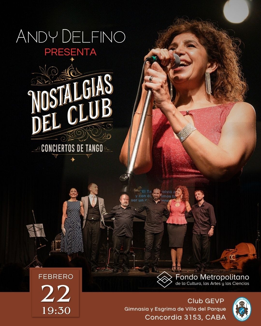 Andy Delfino y su orquesta se presentan en el Club Gimnasia y esgrima de Villa del Parque, CABA. “Nostalgias del Club, Conciertos de Tango” es un proyecto cultural, creado por la cantante Andy Delfino, que evoca y pone en valor la tradición del Tango en los clubes de barrios periféricos de la Ciudad de Buenos Aires, lugares que en su tiempo fueron centros importantes para la vida social y musical, pero que hoy han quedado apartados de la escena tanguera contemporánea.